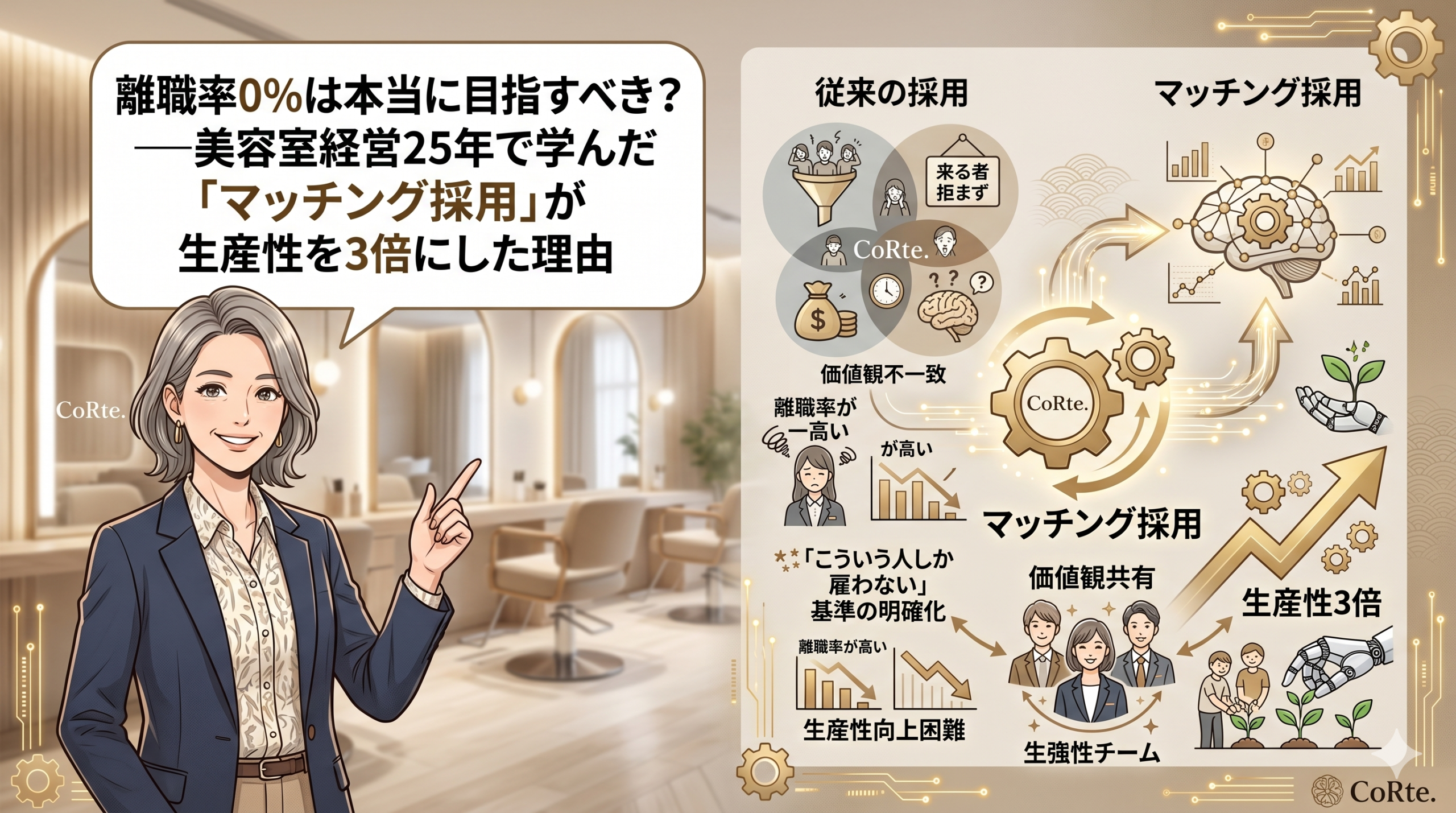 今日は、過去に12人が同時に辞めるという壮絶な経験をした私が、どのように「マッチング採用」というシステムを構築し、スタッフ数を25人から12人に半減させながらも生産性を3倍にしたかをお話しします。